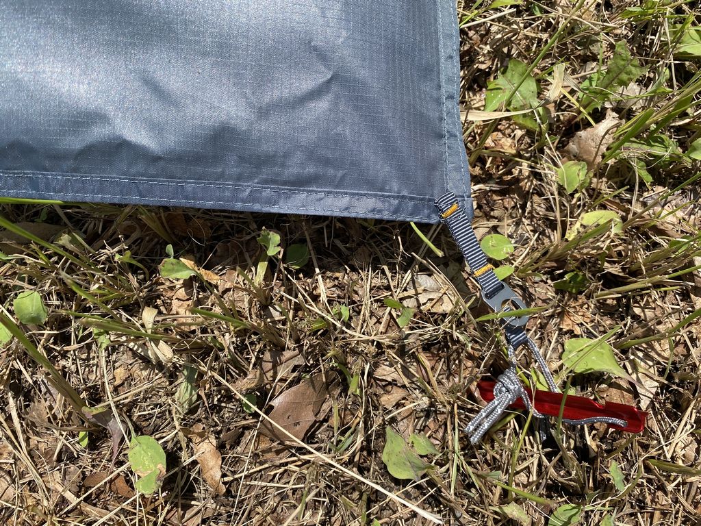 4隅のプラスチックの留め具が上(シートのNaturehikieのタグが上)に来るようグランドシートを広げます。