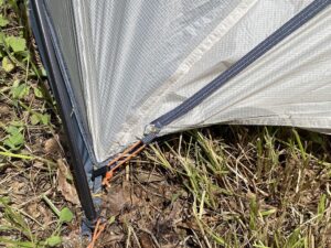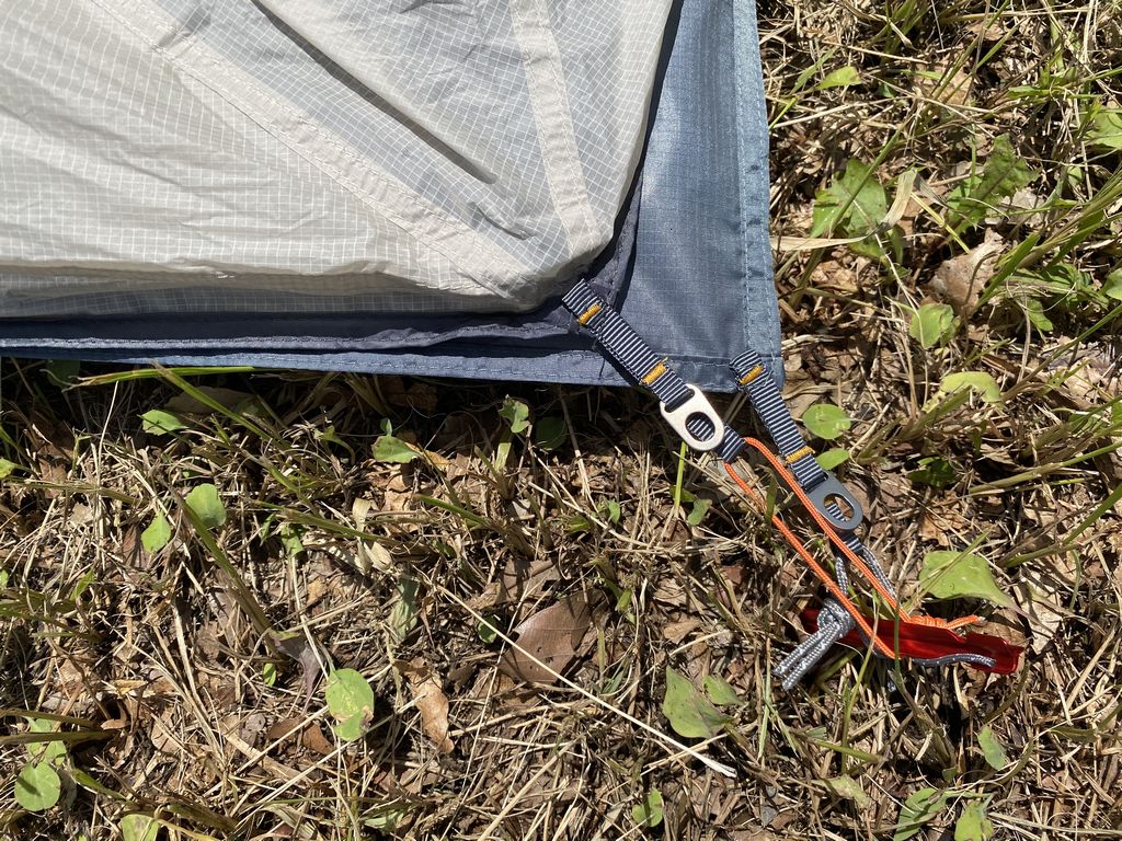 テント入口シートの端に自在ロープが付属しており、この先端をペグで固定します。同様に裏側も固定します。