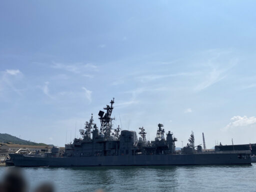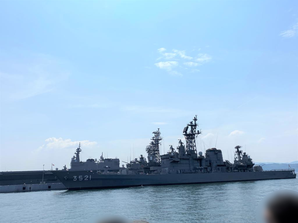 出発すると、進行方向左に艦船を見ながらガイドさんから説明があります。港に戻る際は進行方向右側に艦船が見えますが、ガイドさんの説明が終わっているので撮影ポイントが分かりづらいと思います。