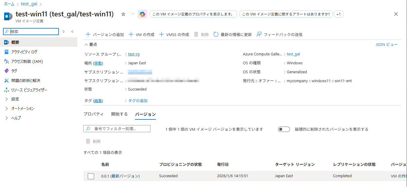 VMイメージ定義”test-win11″を開き、バージョン0.0.1が登録されていることを確認します。