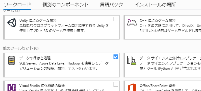 Visual Studio 2019のインストール時に指定できるワークロードで、「ASP.NET と Web 開発」や「データの保存と処理 」を選択することで「SQL Server Express LocalDB エンジン」がインストールされます。